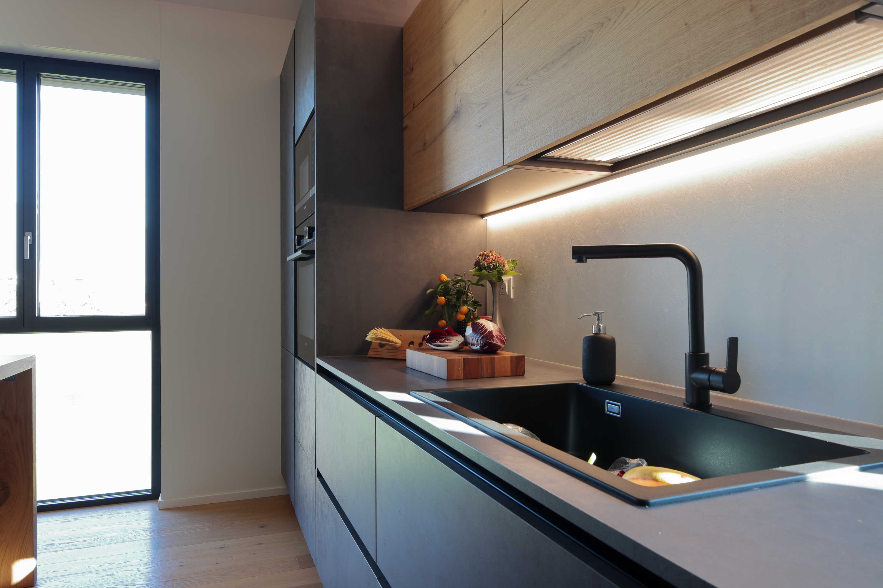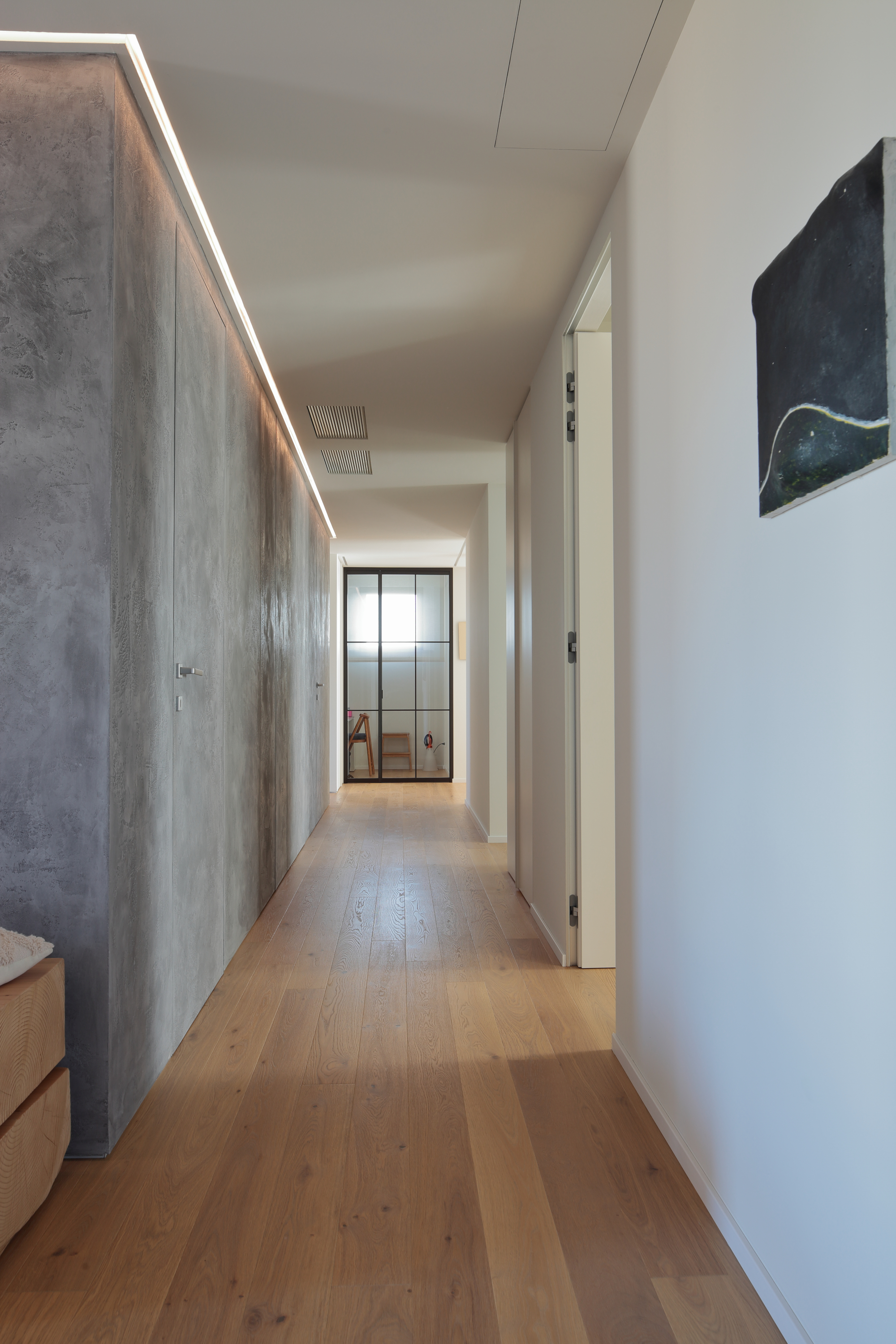 L’elemento fondante del progetto è il “blocco” centrale, evidenziato da una lavorazione superficiale con forte effetto materico, che funge da fulcro attorno al quale ruota la quotidianità degli abitanti e allo stesso tempo demarca le varie funzioni abitative. Detto blocco assume inoltre un ruolo funzionale non secondario celando al suo interno importanti vani secondari come la lavanderia, un piccolo ripostiglio ed un guardaroba.